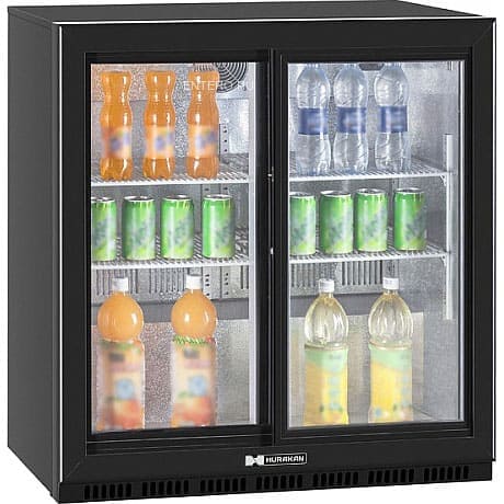 Барный холодильник в аренду 185 л Hurakan купе 2 двери, температурный режим от +1 +10 градусов, с подсветкой, черный цвет, барный морозильник мини для напитков, замороженной продукции, продуктов, дома, бара, ресторана, магазина, офиса, гостиницы, демонстрации, хранения товара, вместимость бутылок банок 142 шт, ширина 865 мм, глубина 520 мм, высота 865 мм, количество полок 2, черный, суточное потребление 2.4 кВт сутки, подсветка
